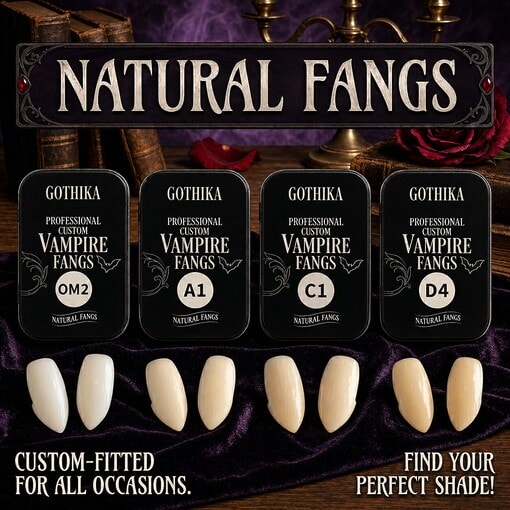 The Professional Standard for Creatures of the Night For decades, Gothika has been the trusted authority for professional scare actors, film makeup artists, and dedicated cosplay enthusiasts. Our Natural Size Custom Fit Vampire Fangs are designed for those who want an elegant, subtle, and highly realistic look. Rather than overwhelming your mouth with massive, cartoonish teeth, the Natural Size provides a sophisticated, everyday-vampire aesthetic that speaks to the true gothic romanticism of the classic monster.