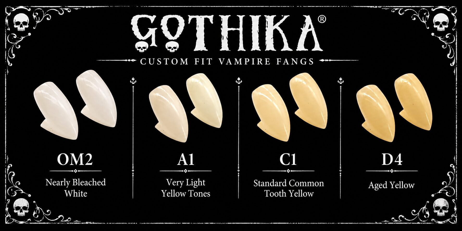 Flawless Integration: The VITA Dental Color System The ultimate illusion relies on seamless blending. Cheap, mass-produced fangs rely on a blinding, artificial white that instantly breaks character. To achieve a truly photorealistic look, Gothika now utilizes the professional VITA Dental Color Match System.