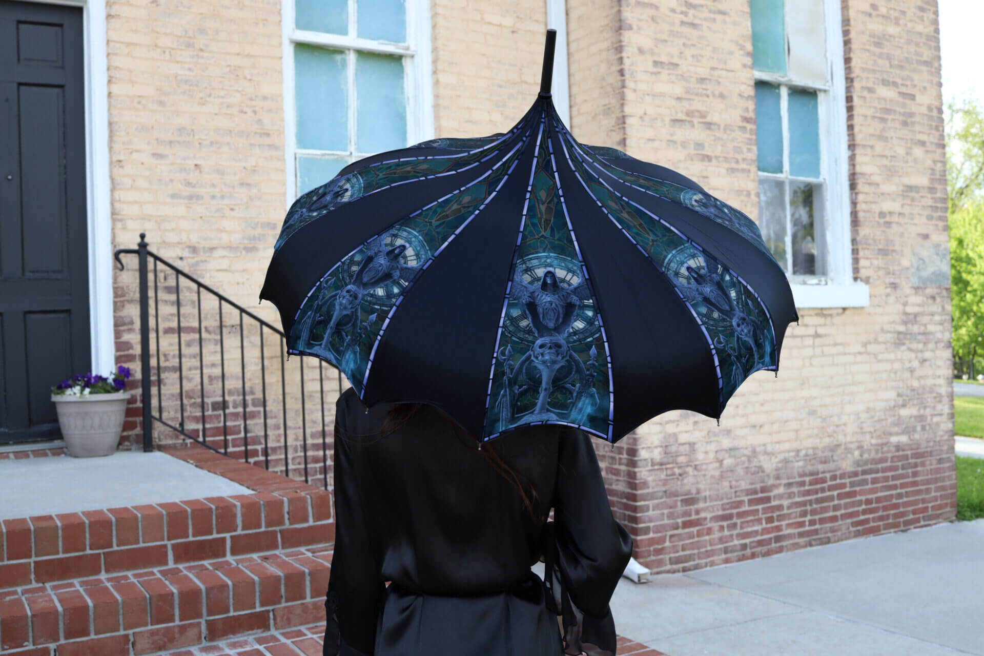 Get ready to turn heads with our Gothic Black Pagoda Umbrella! This full-size, manual open umbrella is the perfect accessory for those who want to stand out with their unique gothic style. This high-quality black umbrella will keep you covered and stylish, whether rain or shine. Our pagoda umbrella features a chic and edgy design that will make a statement. Don’t settle for a boring umbrella when you can upgrade to our Gothic Black Pagoda Umbrella today!