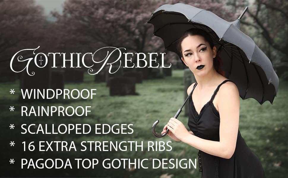 Picture a bat in flight under the tempestuous sky – that’s the striking vision this gothic pagoda umbrella evokes with its scalloped edges reminiscent of a bat’s wings. Crafted for those who dare to stand out, this manual open umbrella is not only a conversation starter but a fortress against the weather. Windproof and waterproof, it offers ultimate protection on stormy days, while its UV-blocking capabilities ensure you remain unscathed by the sun’s harsh gaze.